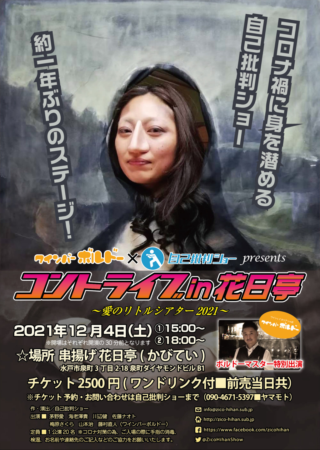 お待たせいたしました!お待たせしすぎたかも知れません。コロナで思うように活動出来ぬまま時間ばかり過ぎてしまいましたが、自己批判ショー約一年ぶりにコントライブをやらせていただきます。