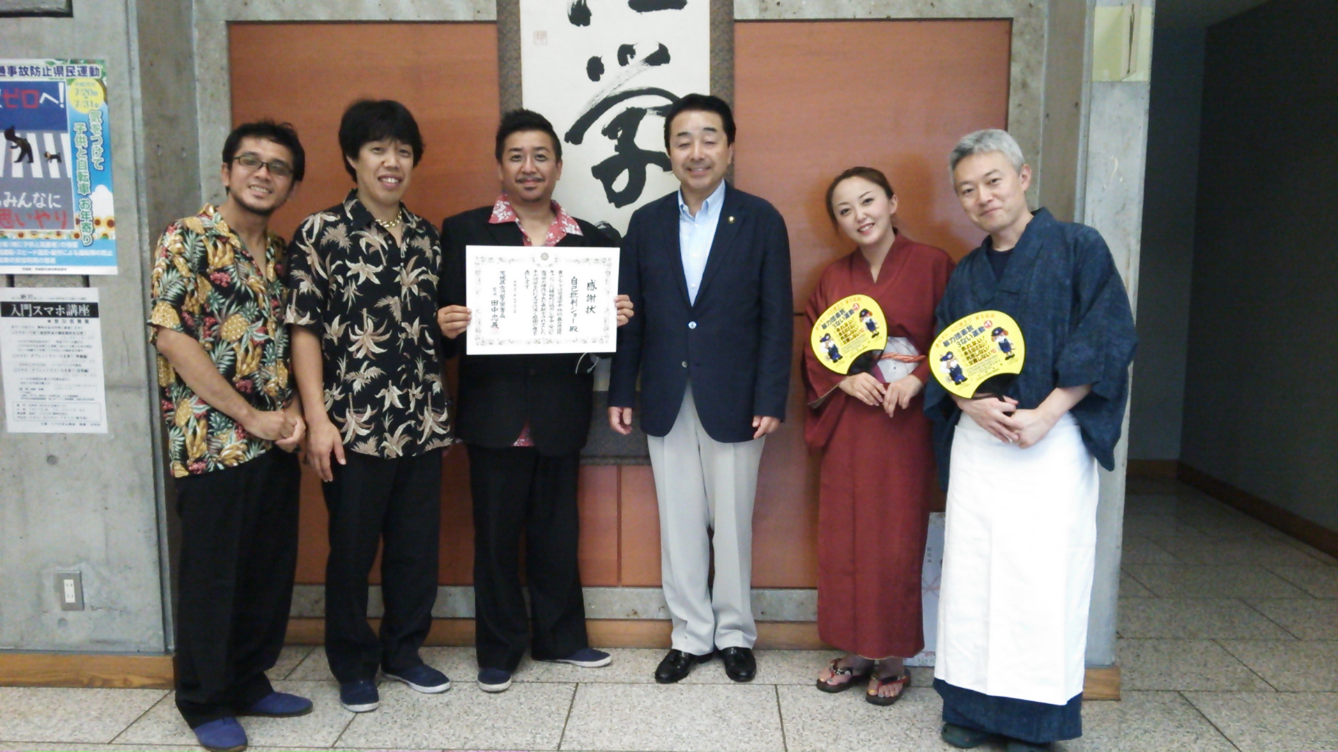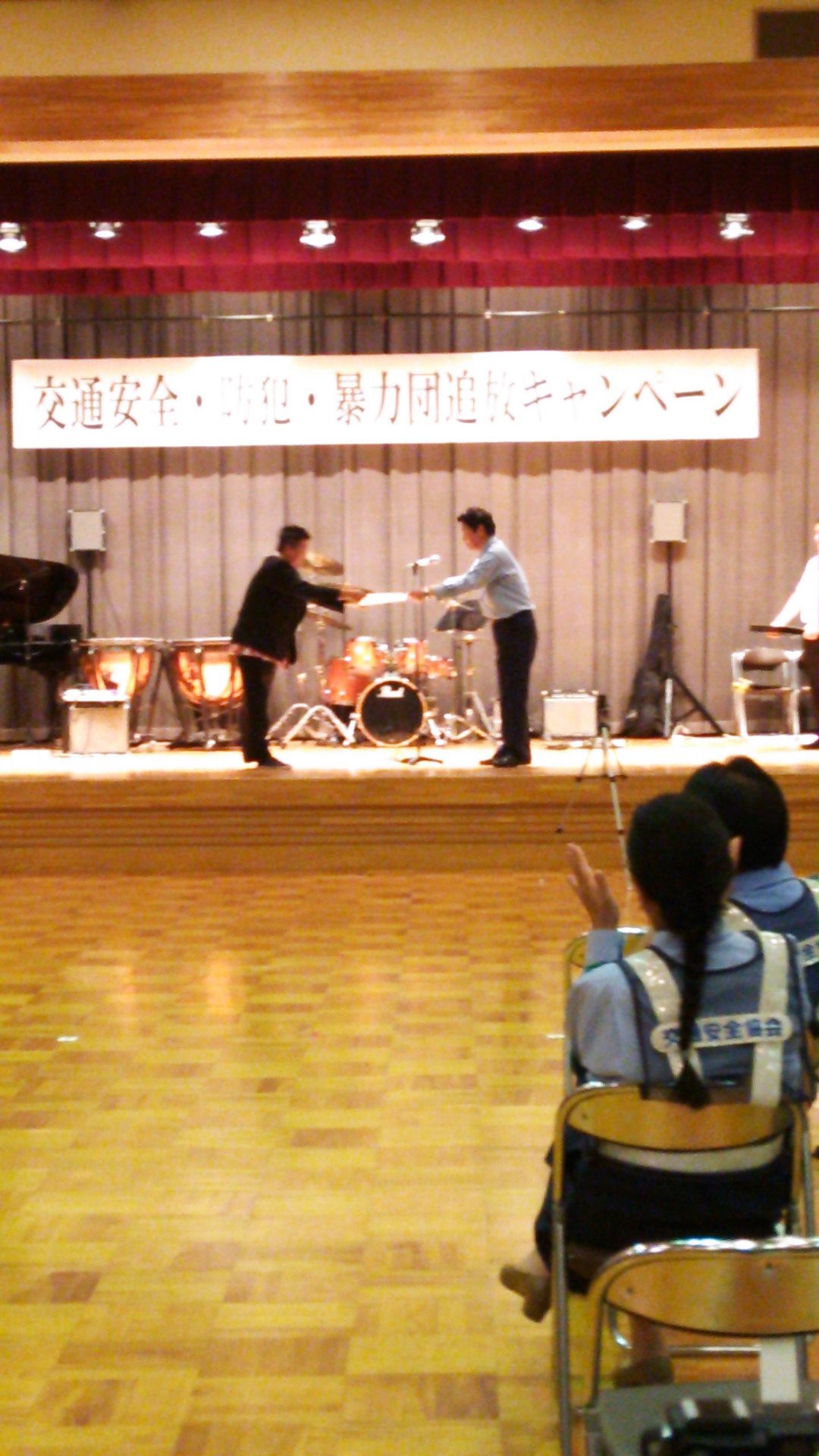 交通安全や防犯の講話に混ざってキャンペーン用のコントを披露。当初怒られるのでは?と思っておりましたが、いざ始まってみると会場全体はとても暖かい雰囲気で、お約束のシーンでは力強い拍手をたくさんいただきました。